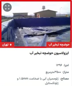 پروژه ایزولاسیون حوضچه تبخیر آب در تهران در سال 1396 آغاز شد و طی 4 روز به پایان رسید. این پروژه با مساحت 3500 مترمربع با هدف ایجاد یک سیستم ایزولاسیون مطمئن و کارآمد برای حوضچه تبخیر آب انجام شد. در این پروژه از ورقهای ژئوممبران آبی با ضخامت 1.5 میلیمتر و ژئوتکستایل به عنوان لایههای ایزولاسیونی استفاده شد. ژئوممبرانهای آبی به دلیل مقاومت بالا در برابر نفوذ آب و دوام طولانی، انتخاب مناسبی برای ایزولاسیون حوضچه بودند. ژئوتکستایلها نیز به عنوان لایههای تقویتی به بهبود عملکرد سیستم ایزولاسیون و افزایش دوام و پایداری حوضچه کمک کردند. اجرای دقیق و استفاده از مصالح با کیفیت بالا، تضمینی برای کارایی و عمر مفید طولانی این پروژه بود.